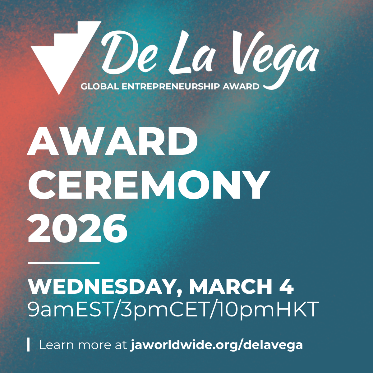 The De La Vega Global Entrepreneurship Award is back this March, bringing together JA student entrepreneurs from around the world for a global celebration of innovation, leadership, and impact. Join us on March 4, 2026, at 9amEST/3pmCET/10pmHKT for the live, virtual awards ceremony and see the finalists take the global stage. Watch the livestream from anywhere (and learn about the 2026 finalists) at jaworldwide.org/delavega.