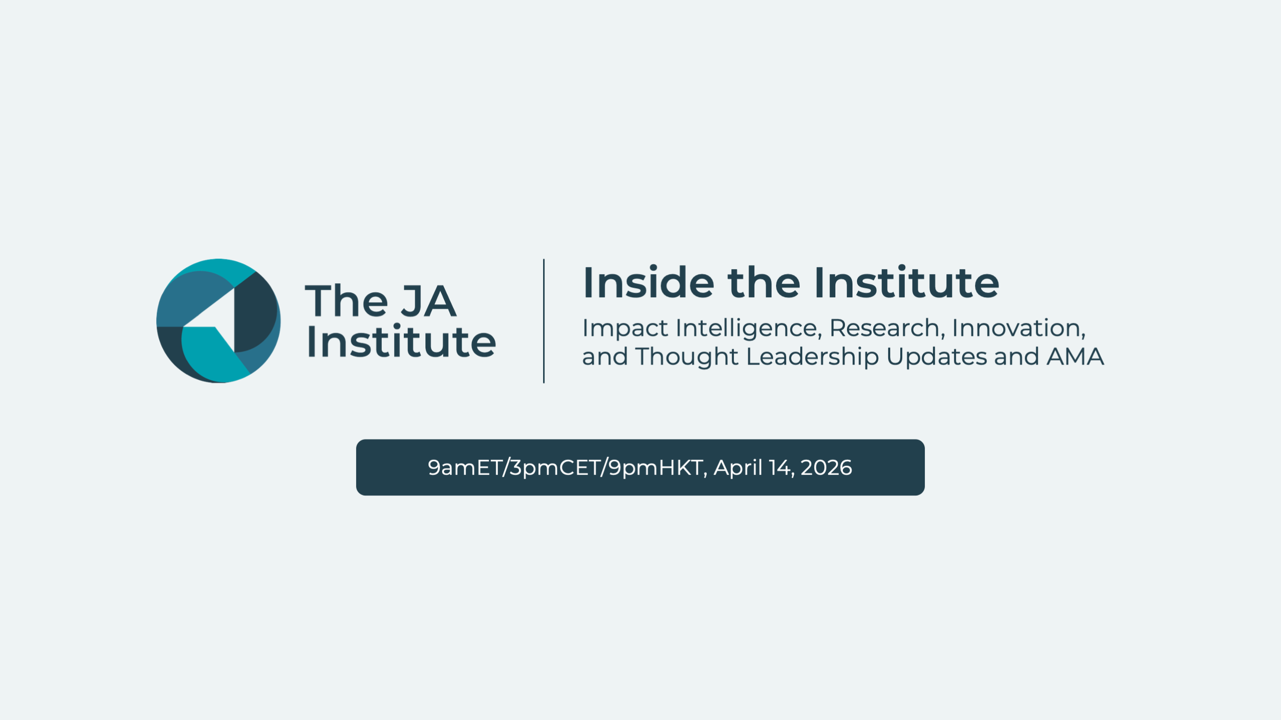 We’re excited to invite you to "Inside the Institute,"a quarterly session designed to keep you connected with the work of The JA Institute and our progress on Impact Intelligence. Held three times a year directly after the JA Global Town Hall, this one-hour session blends updates, insights, and your voices. You’ll hear the latest on The JA Institute’s strategic priorities, dive into a spotlight initiative, and take part in interactive discussions that shape how we track and understand our global impact. Register today.